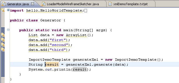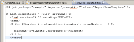 5. Añado la línea <%@ jet package=»example» imports=»java.util.*» class=»ImportDemoTemplate» %> al fichero. Esto me crea la clase ImportDemoTemplate.