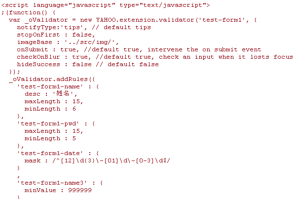 3. YUI Unobstrusive Javascript Validation: como la anterior, pero sobre YUI (si no estáis en contra, la librería Javascript que usaremos para los componentes). Habría que generar desde Jaxcent esto: