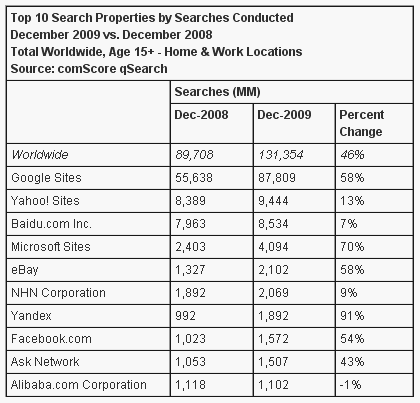 En total más de 131.000 millones de búsquedas en el mundo en diciembre de 2009, un 46% más respecto al mismo mes del año pasado.