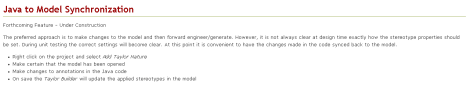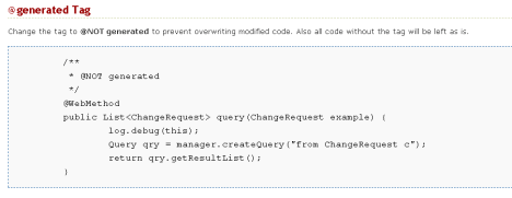 – Mantener parte del código generado: uno de los temas más conflictivos en MDA. Taylor MDA no usa sólo la estrategia de usa la estrategia de heredar de una clase abstracta, si no que permite definir una etiqueta: