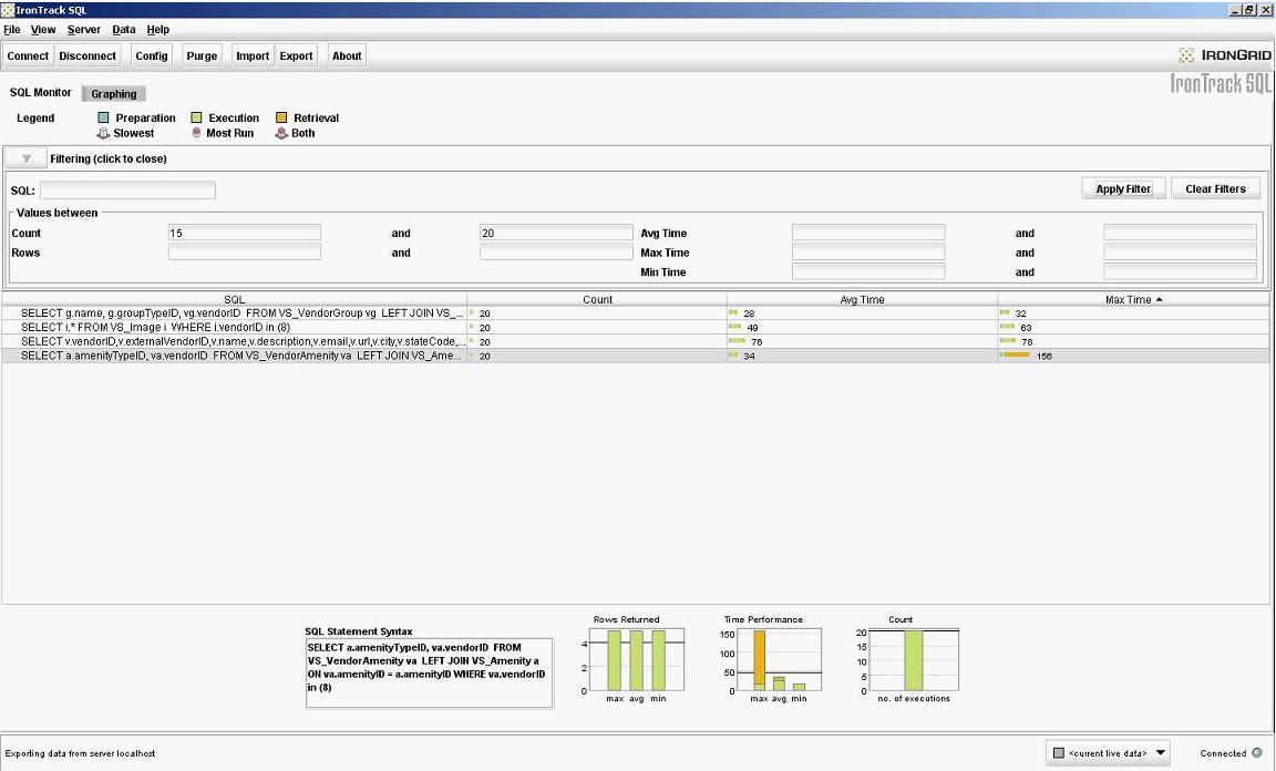 IronTrack SQL prove un interfaz GUI con gráficos, informes, filtros,… y análisis de las SQL lanzadas.