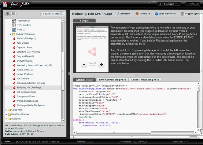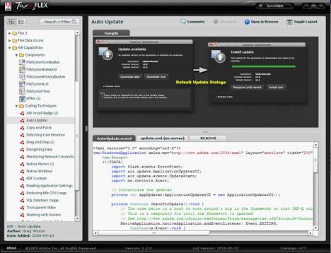 Su objetivo fundamental es servir como referencia a los programadores tanto novatos como con experiencia en Flex de sus capacidades, y lo cierto es que para cada demo incluye el código fuente, explicaciones,…vamos, imprescindible J.