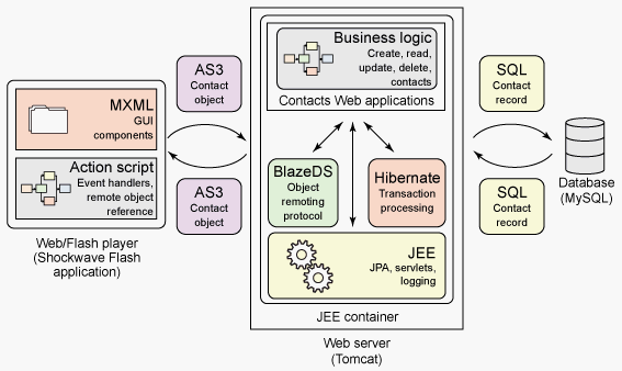 En el ejemplo la Capa de Negocio usa JPA (con Hibernate) para la persistencia y BlazeDS para la comunicación.
