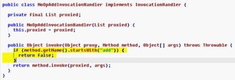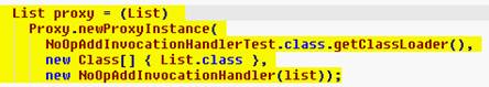 Para crear un Proxy (NoOpAddInvocationHandler) de la clase List haría algo como esto: