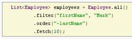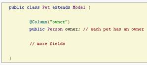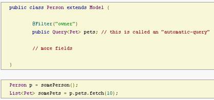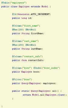 – Intrusivo. Los objetos persistentes extienden de la clase Model(el código depende de Siena). Tampoco es que esto sea un gran problema, no acabamos haciéndolo igual nosotros y además alguien ha cambiado alguna vez de motor de persistencia en un proyecto en marcha. Tiene una forma de trabajar con clases que no heredan de Model