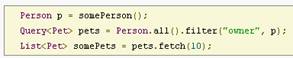– Limitado. El API se ha diseñado para que todas las consultas puedan ser ejecutadas usando sólo un índice. Todas las consultas se realizan sólo sobre una tabla, no se pueden hacer subconsultas ni JOINs y no se puede utilizar OR en una cláusula WHERE. De este modo se consigue que todas las consultas puedan ser realizadas utilizando sólo un índice y así sean lo más rápidas posible. Esta estrategia es la que viene siendo utilizada por las aplicaciones que necesitan ser altamente escalables. Las bases de datos «en la nube» Big Table de Google, SimpleDB de Amazon, utilizan esta aproximación.