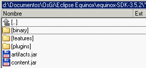 Dentro de la carpeta plugins está el jar: org.eclipse.osgi_3.5.2.R35x_v20100126.jar que es el que permite levantar el entorno OSGi e instarlar, iniciar, detener y desinstalar nuestros módulos