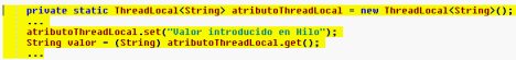 ThreadLocal proporciona el mecanismo para transmitir datos a lo largo de la ejecución de un hilo.. Cualquier parte de la aplicación puede tener acceso a esos datos que no están visibles para otros hilos de ejecución: