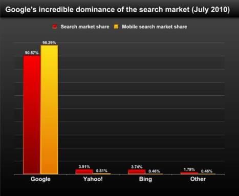 Si ya de por sí Google domina el mercado en cuanto a búsquedas en la red, los datos sobre búsquedas realizadas en dispositivos móviles son apabullantes. Sólo hay que observar el siguiente gráfico.