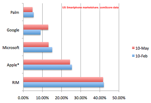 Apple sigue ganando adeptos, pero a un ritmo inferior. No obstante, en las cifras obtenidas no se reflejan las ventas logradas por el nuevo iPhone 4, estimadas en más de 1,7 millones de unidades, en parte porque su salida al mercado fue posterior a la elaboración del estudio.