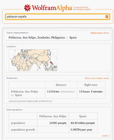 Wolfram Alpha trata de entender la consulta como si fuera una persona, y trata de ofrecer una respuesta concreta pero extensa en cuanto a datos.