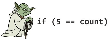 “Condicionales Yoda” – usar if(constante == variable) en lugar de if(variable == constante), comoif(4 == foo). Es como decir “Si azul es el cielo” o “si alto es el árbol”.