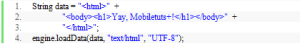 Ahora se reemplazará la llamada loadUrl() por loadData(), que recibirá 3 argumentos: