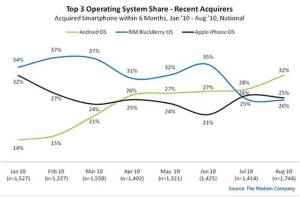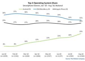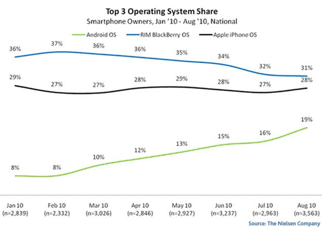 Según según el último informe del instituto de mercado Nielsen, las ventas de smartphones con Android superaron en ventas a las del iPhone este año. También supera a las ventas de BlackBerrys.