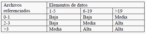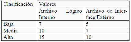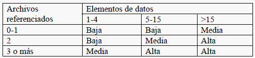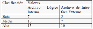 · Clasificación de los Archivos Lógicos Internos y Archivos de Interfaz Externos: donde «Tipos de registro» representa un subgrupo de elementos de datos reconocibles por el usuario, y «Elementos de datos» representa la cantidad de elementos de datos básicos (campos únicos) que componen el Archivo.