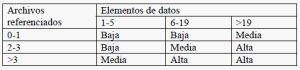 · Clasificación de las Salidas Externas y Consultas Externas: «Archivos referenciados» representa el número de Archivos Lógicos Internos o Archivos de Interfaz Externos vinculados con la Salida Externa o la Consulta Externa, y «Elementos de datos» representa la cantidad combinada de elementos de datos de entrada y de salida que componen la Salida Externa o Consulta Externa.
