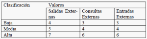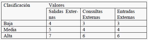 · Clasificación de las Entradas Externas: «Archivos referenciados» representa el número de Archivos Lógicos Internos mantenidos por la Entrada Externa, y «Elementos de datos» representa la cantidad de elementos que componen la Entrada Externa.