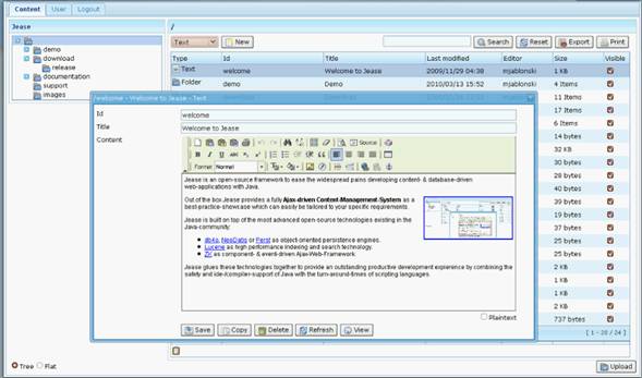 Podéis acceder a una demo en http://demo.jease.org/cms con usuario y password demo.