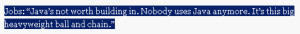 Lo cierto es qque no es reciente que Steve Jobs nunca tuvo mucho aprecio por Java, como ya vaticinaba (debió consultar a Rappel en este caso) en 2007: