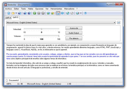 Balabolka es un programa TTS (Text-To-Speech), permite convertir cualquier texto directamente en audio.