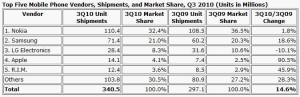 La compañía presidida por Steve Jobs envió 14,1 millones de unidades, registro que le valió colarse entre los cinco mayores comercializadores de la industria, con un 4,1% del total de la industria, superando a RIM, que creció a un 3,6% y desplazando por primera vez del Top 5 a Sony Ericsson (desde que la IDC comenzó con su medición en el 2004).
