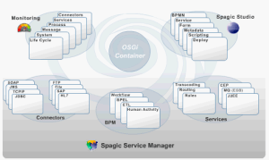 · Spagic Service Manager: es el Middleware en sí. Usa OSGi para ofrecer una solución modular en la que se puedan desplegar diferentes elementos. Incluye conectores (SOAP, JDBC, JMS, TCP,…) y servicios de infraestructura como ESB, Registro, motor BPEL,…
