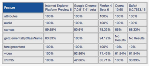 En las pruebas se han tenido en cuenta; atributos, audio, vídeo, canvas, getElementsByClassName, foreigncontent y XHTML5.
