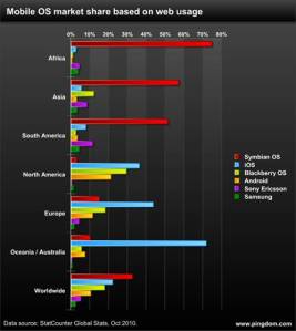Apple iOS lidera en uso de web móvil en América del Norte, Europa y Oceanía, mientras Symbian lidera en África, Asia y América del Sur.