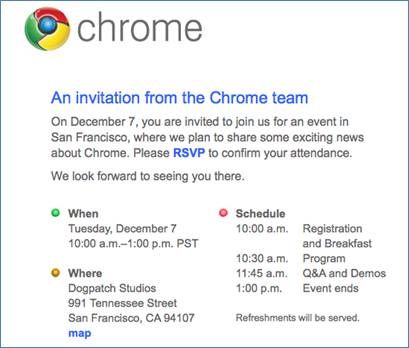Según parece Google Chrome OS será presentado el próximo martes, 7 de diciembre. Al menos es la fecha del evento al que la compañía del buscador ha invitado a los principales medios en EEUU.