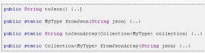 Para añadir el soporte basta con añadir la anotación @RooJson a la clase Java, esto crea estos métodos: toJson(), fromJson(…), toJsonArray, fromJsonArray: