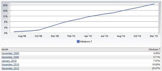 Ballmer, ya puedes respirar tranquilo: Windows 7 está dando buenos resultados. Su rápido ascenso en el mercado le ha permitido alcanzar el 20% de cuota de mercado antes de que el 2010 terminase, y las buenas noticias son que el crecimiento no se detiene y sigue subiendo con buenas previsiones: podría alcanzar el 25% en muy poco tiempo.