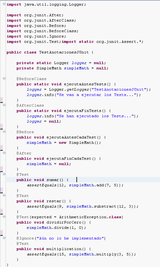 import org.junit.After; import org.junit.AfterClass; import org.junit.Before; import org.junit.BeforeClass; import org.junit.Ignore; import org.junit.Test;import static org.junit.Assert.*; public class TestAnotacionesJUnit { private static Logger logger = null; private SimpleMath simpleMath = null; @BeforeClass public static void ejecutaAntesTests() { logger = Logger.getLogger(«TestAnotacionesJUnit»); logger.info(«Se van a ejecutar los Tests…»); } @AfterClass public static void ejecutaFinTests() { logger.info(«Se han ejecutado los Tests…»); logger = null; } @Before public void ejecutaAntesCadaTest() { simpleMath = new SimpleMath(); } @After public void ejecutaFinCadaTest() { simpleMath = null; } @Test public void sumar() { assertEquals(12, simpleMath.add(7, 5)); } @Test public void restar() { assertEquals(9, simpleMath.substract(12, 3)); } @Test(expected = ArithmeticException.class) public void dividirPorCero() { simpleMath.divide(1, 0); } @Ignore(«Aún no lo he implementado») @Test public void multiplication() { assertEquals(15, simpleMath.multiply(3, 5)); } } |
