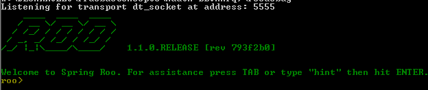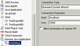 1) En %ROO_HOME%/bin/ he creado un rooDebug.bat al que le he añadido los parámetros de depuración remota (-Xdebug -Xrunjdwp:transport=dt_socket,address=5555,server=y,suspend=n)