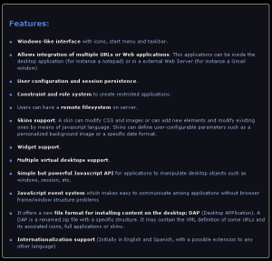 La funcionalidad que ofrece es muy similar a la de EyeOS, a diferencia de este internamente está desarrollo sobre Tecnología J2EE (el escritorio es un WAR).