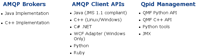 Qpid provee brokers en Java y C++ y clientes en C++, Java JMS, .Net, Python y Ruby.