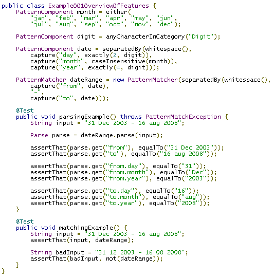 PatternMatcher mailToURLMatcher = new PatternMatcher(sequence(capture(«scheme», text(«mailto»)), «:», capture(«email», emailAddressMatcher)));