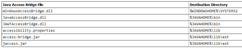 El proceso de instalación de Java Access Bridge consiste en copiar unas DLLs y unos JARs, para Windows 32 por ejemplo: