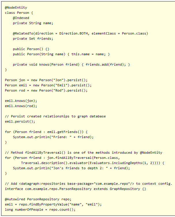 La forma de uso es semejante al modelo JPA, vemos un ejemplo sobre Neo4j: