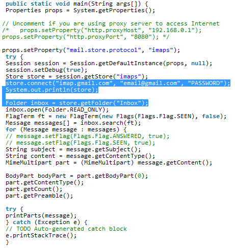 import java.io.InputStream; import java.util.Properties; import javax.mail.Address; import javax.mail.BodyPart; import javax.mail.Flags; import javax.mail.Folder; import javax.mail.Message; import javax.mail.MessagingException; import javax.mail.Multipart; import javax.mail.NoSuchProviderException; import javax.mail.Part; import javax.mail.Session; import javax.mail.Store; import javax.mail.internet.MimeMultipart; import javax.mail.search.FlagTerm; @SuppressWarnings("all") public class InboxReader { public static void main(String args[]) { Properties props = System.getProperties(); // Uncomment if you are using proxy server to access Internet /* props.setProperty("http.proxyHost", "192.168.0.1"); props.setProperty("http.proxyPort", "8080"); */ props.setProperty("mail.store.protocol", "imaps"); try { Session session = Session.getDefaultInstance(props, null); session.setDebug(true); Store store = session.getStore("imaps"); store.connect("imap.gmail.com", "email@gmail.com", "PASSWORD"); System.out.println(store); Folder inbox = store.getFolder("Inbox"); inbox.open(Folder.READ_ONLY); FlagTerm ft = new FlagTerm(new Flags(Flags.Flag.SEEN), false); Message messages[] = inbox.search(ft); for (Message message : messages) { // message.setFlag(Flags.Flag.ANSWERED, true); // message.setFlag(Flags.Flag.SEEN, true); String subject = message.getSubject(); String content = message.getContentType(); MimeMultipart part = (MimeMultipart) message.getContent(); BodyPart bodyPart = part.getBodyPart(0); part.getContentType(); part.getCount(); part.getPreamble(); try { printParts(message); } catch (Exception e) { // TODO Auto-generated catch block e.printStackTrace(); } Flags flags = message.getFlags(); Address[] form = message.getFrom(); } } catch (NoSuchProviderException e) { e.printStackTrace(); System.exit(1); } catch (MessagingException e) { e.printStackTrace(); System.exit(2); } catch (IOException e) { // TODO Auto-generated catch block e.printStackTrace(); } } public static void printParts(Part p) throws Exception { Object o = p.getContent(); if (o instanceof String) { System.out.println("This is a String"); System.out.println((String) o); } else if (o instanceof Multipart) { System.out.println("This is a Multipart"); Multipart mp = (Multipart) o; int count = mp.getCount(); for (int i = 0; i < count; i++) { printParts(mp.getBodyPart(i)); } } else if (o instanceof InputStream) { System.out.println("This is just an input stream"); InputStream is = (InputStream) o; int c; // while ((c = is.read()) != -1) // System.out.write(c); } } } |