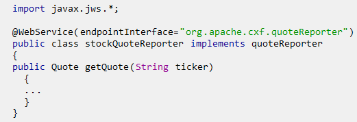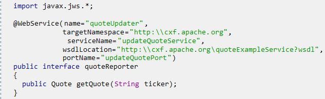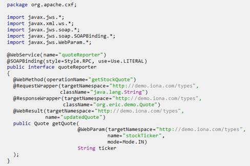 import javax.xml.ws.*; import javax.jws.soap.*; import javax.jws.soap.SOAPBinding.*; import javax.jws.WebParam.*; @WebService(name=»quoteReporter») @SOAPBinding(style=Style.RPC, use=Use.LITERAL) public interface quoteReporter { @WebMethod(operationName=»getStockQuote») @RequestWrapper(targetNamespace=»http://demo.iona.com/types», className=»java.lang.String») @ResponseWrapper(targetNamespace=»http://demo.iona.com/types», className=»org.eric.demo.Quote») @WebResult(targetNamespace=»http://demo.iona.com/types», name=»updatedQuote») public Quote getQuote( @WebParam(targetNamespace=»http://demo.iona.com/types», name=»stockTicker», mode=Mode.IN) String ticker ); } |