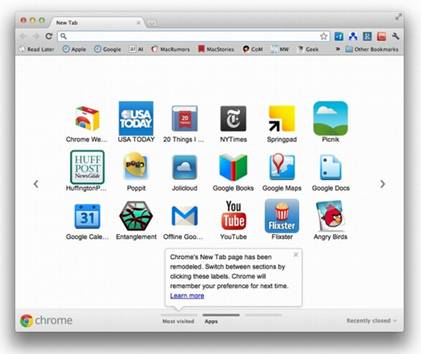 Además de incluir numerosas mejoras de seguridad y el arreglo de algunos bugs detectados, se ha dado un lavado de cara a la pantalla de inicio. Llamada Start Tab, la pestaña de inicio hasta ahora presentaba las aplicaciones instaladas y las últimas páginas. Con Chrome 15 Google da la posibilidad de personalizar la pestaña de inicio.