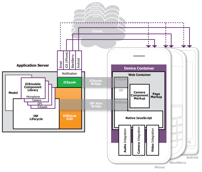 ICEmobile pretende abarcar un amplio espectro de tecnologías de presentación Java como JSP, Spring MVC, GWT. En su oferta inicial ICEmobile-Faces se basa en JSF (Icefaces 2).