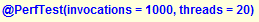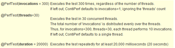 La anotación @PerfTest especifica los datos de ejecución, en el ejemplo 1000 veces con 20 hilos concurrentes.