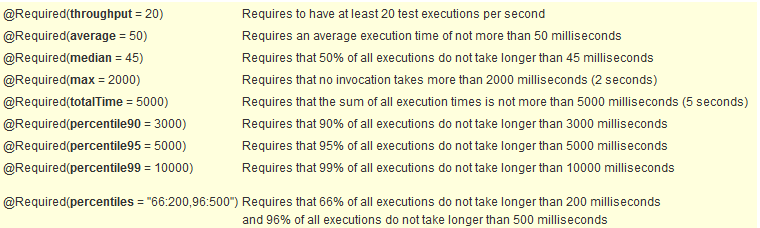 La anotación @Required define que es tolerable un tiempo máximo de ejecución de 1.2 segundos y uno medio de 250 ms.