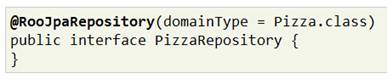 roo> repository jpa –interface ~.repository.PizzaRepository –entity ~.domain.Pizza