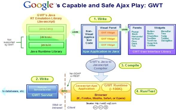 GWT permite crear aplicaciones AJAX en el lenguaje de programación Java que son compiladas posteriormente por GWT en código JavaScript ejecutable optimizado que funciona automáticamente en los principales navegadores.