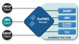 · SwiftMQ Router: es un router de alta escalabilidad y disponibilidad que se integra en una red de routers federadas que soporta colas clusterizables y reconexión JMS.