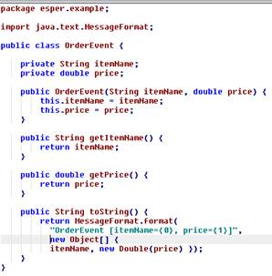 · Indico la consulta en EPL, la consulta es continuamente ejecutada en tiempo real por el motor de Esper cuando llega un nuevo evento o por petición. Esta consulta devuelve la media del precio de todos los eventos OrderEvent que han llegado en los últimos 30 segundos: