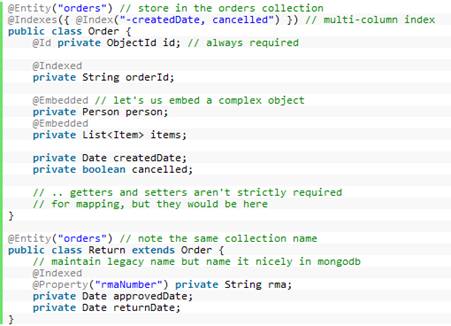 Morphis soporta el polimorfismo (en la figura hemos mapeado Orders y Return con la misma entidad MongoDB orders) como se ve en esta query: