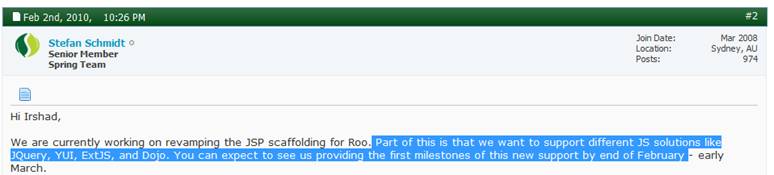 En Spring Roo actualmente están trabajando en que la generación de la Capa Web basada en JSPs soporte diferentes soluciones JS como JQuery, Ext JS, YUI y por supuesto Dojo.